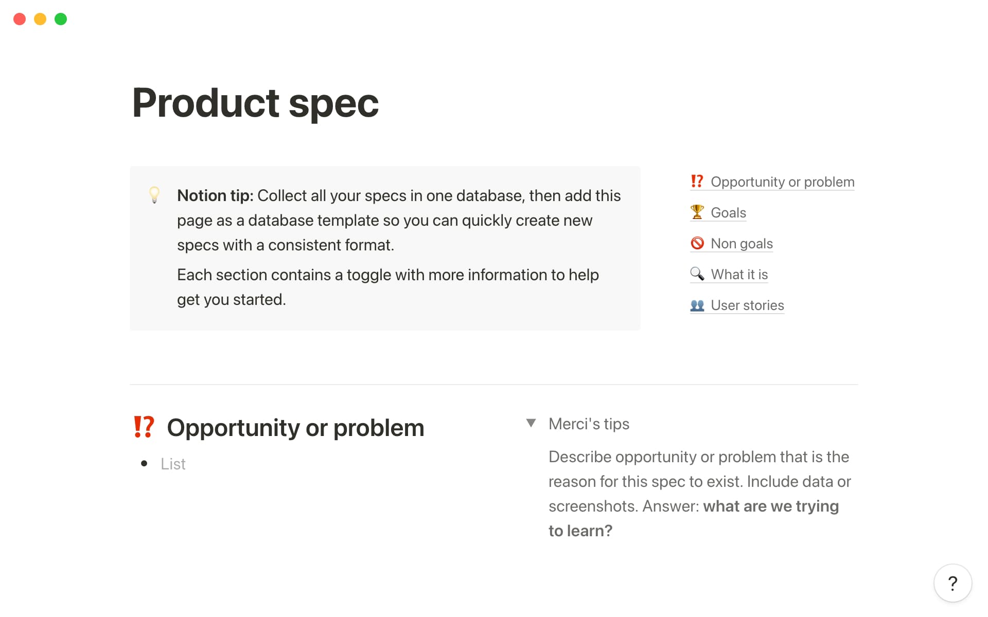 Using the same spec template to develop new ideas in a structured and consistent way builds good habits with your team. Merci's template includes sections to define opportunities, spot potential problems, and create user stories. Embed your prototypes and user research straight into the spec so you can gather all context and make informed decisions without jumping between apps.