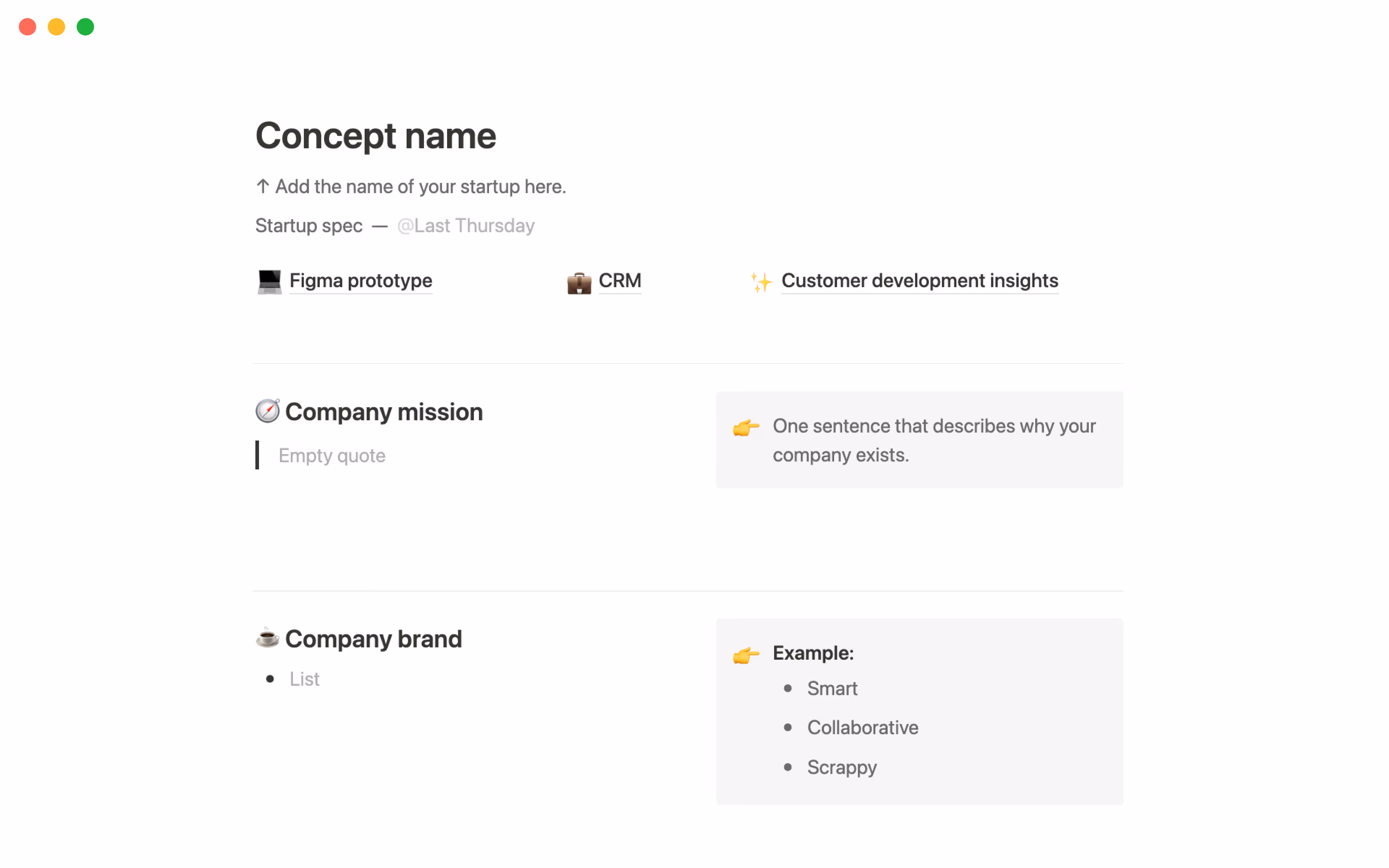 You have an idea. Now it's time to put it through the wringer. Thinking through every aspect of your fledgling company in one page will help you spot areas to flesh out or revise. Your early prototypes and ideal customer profiles inform this spec too — instead of switching between tools, keep your Figma files and CRM in the same page.