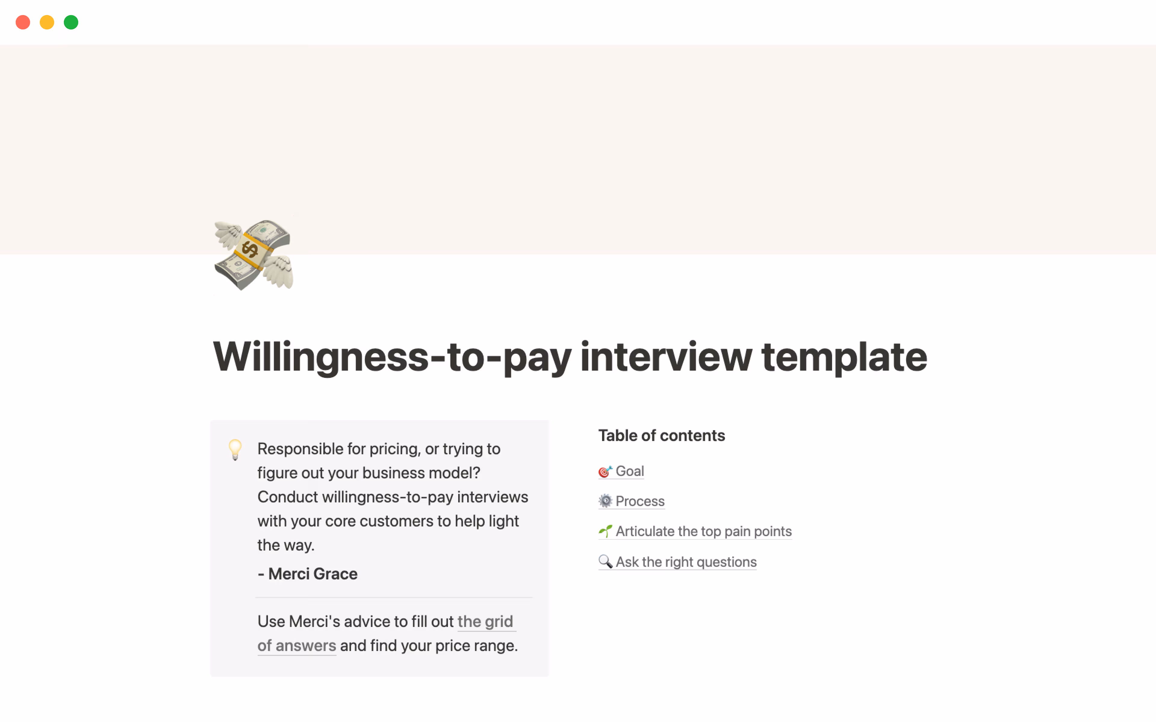 To figure out a business model and pricing strategy, talking to core customers is your best bet. Merci's willingness-to-pay template includes a framework with questions to ask and even what to email them. In the same Notion page, you can consolidate your questions, write your email templates, and log your customer feedback.